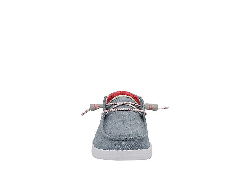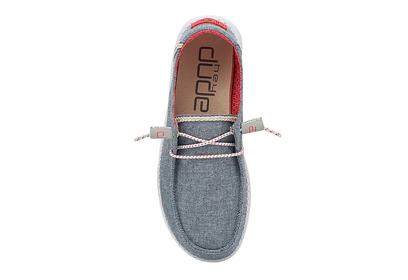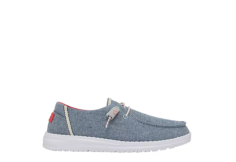 Relax into your passion with the HEYDUDE Wendy Braid women’s slip-on sneaker. With a soft, chambray blend upper featuring flex & fold technology and elastic laces for a secure fit, this slip-on sneaker is machine washable for easy maintenance. The removable Memory Foam insole and leather lining offer ergonomic comfort and cushioning, while the ultralight outsole lets you explore unfettered.ย