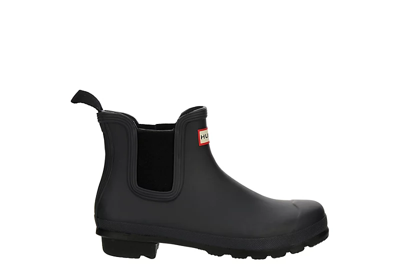 Stay rain-ready in the Hunter Original Chelsea women’s rain boot. With a handcrafted, natural rubber upper featuring a matte finish for year-round style, this pull-on rain boot has a rear pull tab and elasticized gussets for easy entry. The polyester lining comforts while the rubber traction outsole has the signature Hunter Original tread.