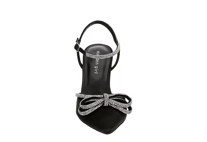 Make a stylish statement in the Dreamy women’s pump from Madden Girl. This head-turning design features a satin upper with rhinestone accents, a glittery bow detail, a sleek pointed toe, and a thin ankle strap that adjusts for a perfect fit. A padded footbed soothes your feet, while the 3½” stiletto heel elevates your look, and the TPR outsole provides excellent grip.